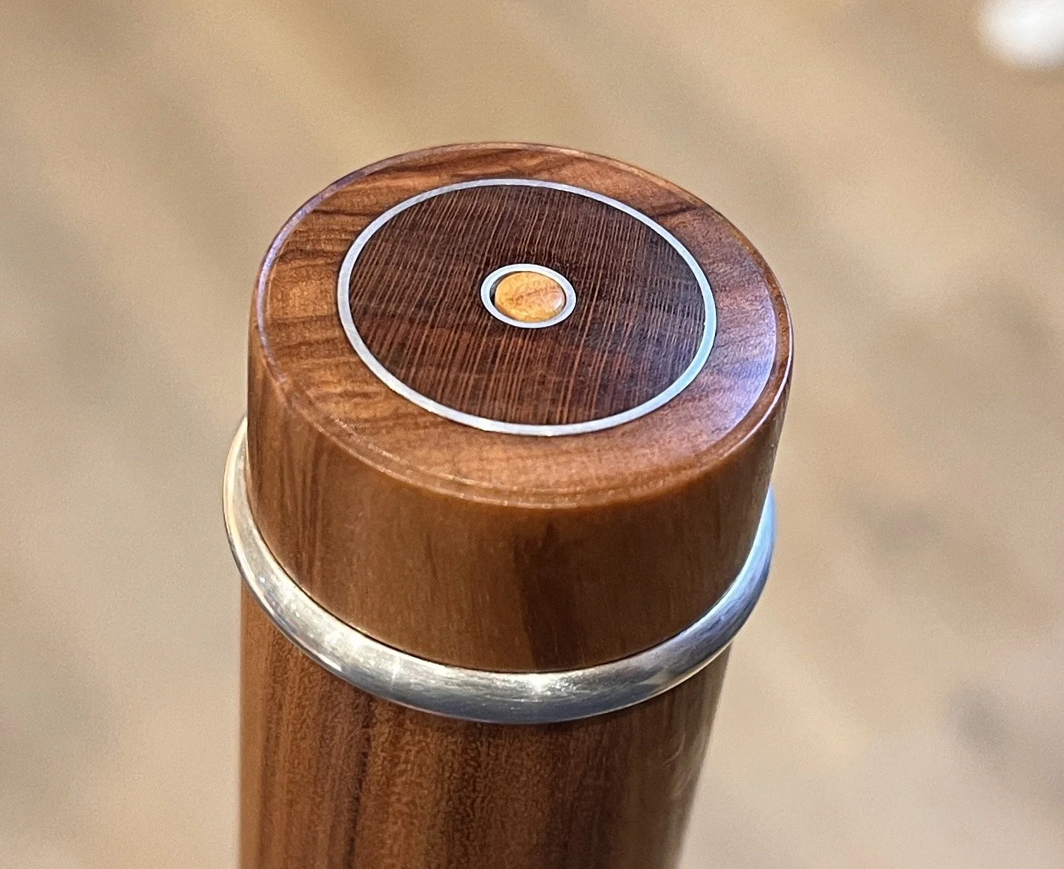 Olive wood, unlike the other available woods, comes from Europe, especially Italy and Turkey. It is comparatively light, yet dense and oily, has a pleasant smell and a very lively grain. It is slightly softer than boxwood, but has a similar feel to it. In terms of sound, I cannot find any disadvantages compared to tropical woods; a flute made of olive wood sounds just as lively as one made of grenadilla or mopane, maybe with a hint more “chiff”. It is a very good alternative for tropical woods, especially from an ecological point of view, as well as for people who are looking for a very light flute: the weight saving compared to Blackwood is approx. 15%, or, in absolute numbers: an eight-keyed Olivewood flute weighs about as much as a keyless Blackwood flute.